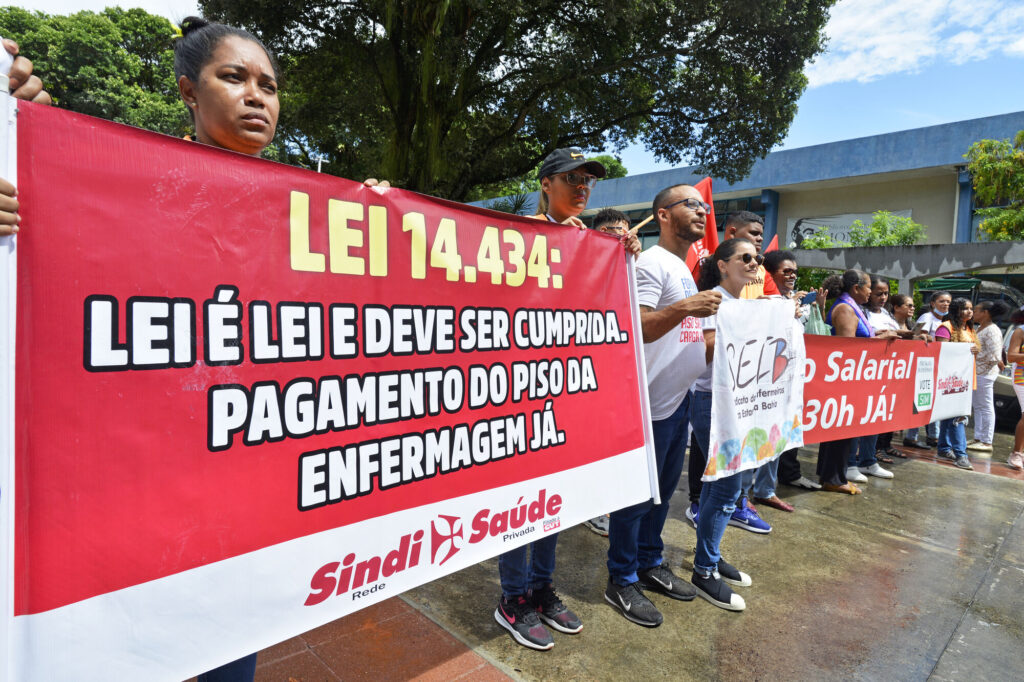 Manifestação aconteceu na manhã desta segunda-feira (18), na frente do Hospital Geral do Estado (HGE), em Salvador. Vestidos com jalecos e nariz de palhaços, enfermeiros fizeram um protesto para cobrar o pagamento do piso de enfermagem na manhã desta segunda-feira (18), na frente do Hospital Geral do Estado (HGE), em Salvador. Segundo o diretor do Sindicato dos Trabalhadores da Saúde (Sindsaúde), Waldir Cerqueira, a verba é subsidiada pelo Governo Federal, mas, até o momento, não foi repassada para os profissionais. O protesto causou reflexo no trânsito da região do HGE e foi encerrado por volta das 9h30. Em nota, a Secretaria de Saúde do Estado da Bahia (Sesab) informou que o Instituto de Gestão e Humanização (IGH), assim como todos os demais prestadores da rede direta estadual, receberam os recursos federais para o pagamento do piso de enfermagem. De acordo com a Sesab, a entidade já tinha sido notificada administrativamente para realizar o pagamento ao quadro de colaboradores da enfermagem. A secretaria afirmou ainda ainda que mesmo com a falta do pagamento, considera “inoportuno e descabido” qualquer bloqueio ao fluxo de entrada de uma unidade hospitalar. No dia 5 de outubro, a Sesab anunciou o início do repasse de R$ 40 milhões para implementação do piso nacional de enfermagem. O montante se refere ao período de maio a agosto de 2023 e será destinado a 15.895 profissionais. A secretaria afirmou que vai fazer pagamentos complementares referente ao piso salarial considerando os recursos do Governo Federal. De acordo com a Lei nº 14.434/2022, que institui o piso salarial da Enfermagem (enfermeiros, técnicos, auxiliares e parteiras), sancionada em agosto de 2022, cada uma dessas modalidades profissionais receberá um valor mínimo único em todo o país. O Piso Nacional da Enfermagem beneficia aqueles que realizam atividades em instituições de saúde públicas e privadas. Para os enfermeiros, o valor do piso é R$ 4.750, para os técnicos de enfermagem, é de R$ 3.325, e para os auxiliares de enfermagem e parteiras, de R$ 2.375 por 44 horas de trabalho semanais. Para trabalhadores submetidos a carga horária inferior a 44 horas, o valor do piso deve ser proporcional à carga horária respectiva. São beneficiados pelo piso apenas os profissionais que recebem menos que o valor instituído pela lei para sua respectiva categoria.