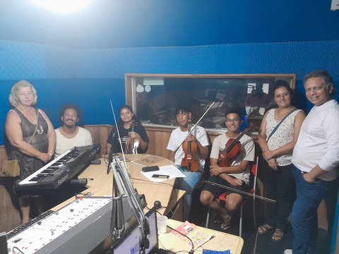 Franedir Gois/OPovonews A música permite expressão emocional, fornece um prazer estético, diverte, comunica, obtém respostas físicas, conduz conformidade às normas sociais, valida instituições sociais e ritos religiosos, ela também contribui para a continuidade e estabilidade da cultura. Com essa ideia a programação da Rádio Caraípe 100,5 realizou um sonho de ter em seus estúdios o Maestro Orley e seus comandados, seus artistas nativos que ele mesmo lapidou e os fez protagonistas da arte de levar alegria e paz onde quer que passem. O Programa Vozes e Riquezas da Terra, na manhã de sábado, 16 de dezembro recebeu os membros da Orquestra 9 de Maio e veja alegria que nos trouxeram embelezando o mês de dezembro com as canções natalinas. Maestro Orley falou sobre as dificuldades e o prazer que sente em poder estar realizando esse trabalho que é de suma importância para Teixeira de Freitas e região.