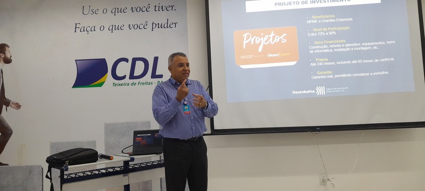 Helder Falk representante do DesenBahia falou sobre os projetos e investimentos, capital de giro, taxas e oportunidades para crédito rural, máquinas e equipamentos, FUNGETUR (turismo) e crédito para inovação.