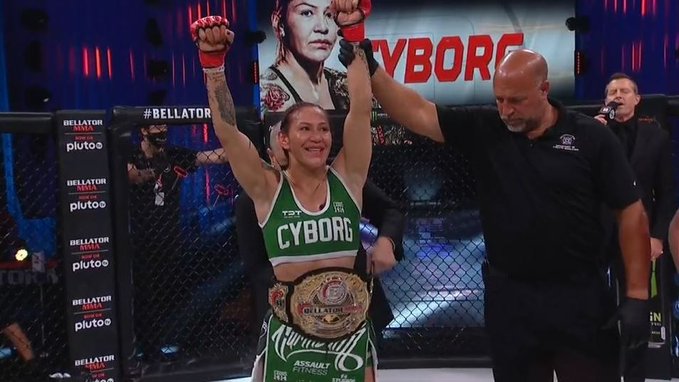 Cyborg, de 35 anos, agora tem três lutas e três vitórias no Bellator, todas elas pelo cinturão da categoria.