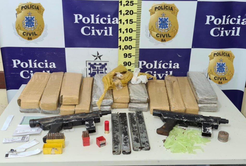 Dezoito tabletes de maconha, duas metralhadoras 9 mm, quatro carregadores, munição para calibre 12, 46 pinos vazios para acondicionar cocaína e um veículo roubado foram apreendidos, nesta sexta-feira (21), em Feira de Santana.