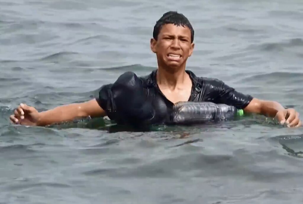 Um jovem migrante com garrafas de plástico amarradas ao seu corpo chegou ao enclave espanhol de Ceuta nesta quarta-feira (19) após nadar na fronteira entre Espanha e Marrocos. Imagens mostram soldados conversando com o garoto visivelmente emocionado antes de ele correr para a praia de El Tarajal e tentar escalar uma parede de pedras.