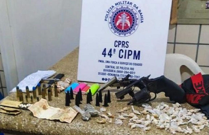 Com o suspeito, os militares encontraram 01 revólver marca Rossi, calibre .38; 01 revólver Rossi, calibre 22 (ambos com numeração suprimida); 85 (oitenta e cinco) pedras de crack; (03 três) buchas de maconha; 02 (dois) pinos de cocaína;01 caderno de anotações (relativo ao tráfico); 04 (quatro) munições CBC intactas calibre .22; 09 (nove) munições CBC intactas, calibre .38; 01 munição CBC intacta de calibre restrito .44 e uma faca.
