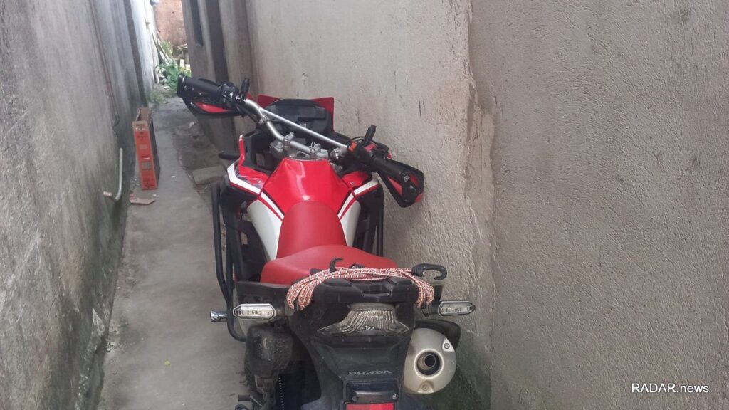 A moto, modelo XRE-300, cor vermelha, foi deixada no imóvel pelo namorado de uma das jovens, conforme constatou a polícia.